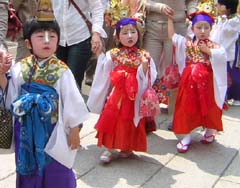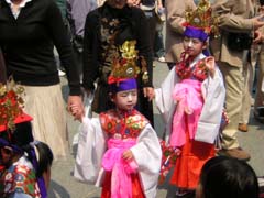 春の大例祭には、盛装した子どもたちの稚児行列が行われます。錫杖とほら貝に先導され、親御さんに手をひかれて境内を歩いてきました。おかあさんたちも思いっきりおしゃれをして、あちこちでカメラやビデオが回ってました。