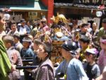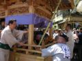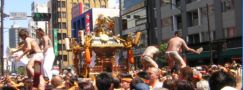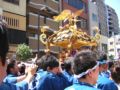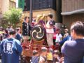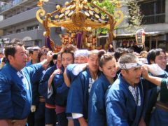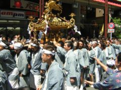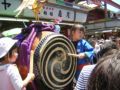 予備知識なしだったので、どれがメインの神輿かよくわかりませんでしたが、大きな神輿あり、小ぶりのものあり。中にはモンモン入れたおにいさんが乗っかって拍子とっているのもありました。神輿に乗っかるのは禁止されたらしく、問題になっちゃってるとか。でも、祭りだ、祭りだ、いいじゃないか! なんちゃって(^_^;) 担ぐほうは重くて大変らしいですけどね。その担ぎ手がいいっていうんなら……。