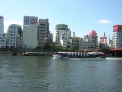 浅草から、そして浅草へ、いっぱいのお客さんを乗せた水上バスがかなり頻繁に行き来しています。昔は、こうして江戸の町を船が縦横無尽に走っていたのでしょうね。といっても、いまは船の向こうに見えるのはビルばかりですが。
