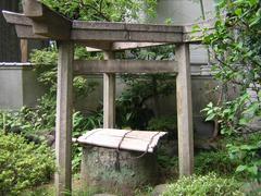 もう一つ興味があったのは三本足の鳥居です。不思議ですよね。鳥居が囲んでいるのは井戸です。背後には三本足で丸い屋根を支えた手水鉢もあります。屋根には三井家の家紋があり、三本足の鳥居は三越にもあるということです