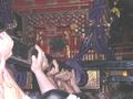 その後、担ぎ手が交代。汗だくになった人はいったん身を引いて(笑)、ひとりひとり名前を呼ばれて、神社から鉢巻の手拭いを渡された人が担ぐようです。そして、再び頭上に差し上げられた神輿は、そのまま社殿の中に運び込まれます。これを「昇殿勇み」と呼ぶらしいのですが、社殿の内側で神輿がもまれるという祭りは初めて見ました! 確かに広い社殿ではありますが、屋根のあるところでねぇ、すご過ぎる! 単なるよそ者の見物人は社殿の中でみることは難しいですが、離れたところからでも社殿の中でもまれている神輿を、ちょっとだけ垣間見ることができます。