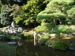 薬師堂参拝のあとには庭園に案内されます。庫裏の裏手にあるお庭は、池泉観賞式蓬莱庭園といわれ、県指定の名勝となっています。江戸時代につくられたもので、高野山の普門院、鳥取の興禅寺とともに江戸時代の日本三名園に数えられています。滝や築山石組があり、下側に池泉のある造りは、江戸初期の庭園の典型的なかたちだそうです。