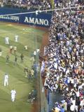 ホーム側はそんなわけで毎年けっこう人が集まりますが、今年は古田選手&監督の最後の試合ということがあって、レフトスタンドも満席。内野席もかなりしっかり入ってました。このカードにしては、トップシーズンより多いくらいかも(^_^;) 7回の応援タイムのときにはバックスクリーンに古田監督が大きく映し出され、スワローズファンの応援ボードもいっぱい映されていました。