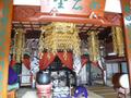 山車の通る通りのところどころに、舞台が設けられていて、ここでもお囃子と舞が行われています。山車が通りかかると、山車の舞台と向き合ってお囃子と舞の競演が行われます。こういうときには山車の舞台がぐるりと回ります。そういえば、道路を直角に曲がるときにも舞台がくるくると回っていました。後ろからついて行っても、ちゃんと舞台を見ることができるんですね!