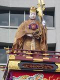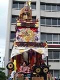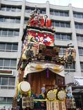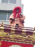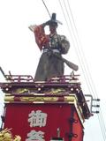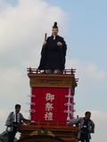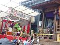 山車の通る通りのところどころに、舞台が設けられていて、ここでもお囃子と舞が行われています。山車が通りかかると、山車の舞台と向き合ってお囃子と舞の競演が行われます。こういうときには山車の舞台がぐるりと回ります。そういえば、道路を直角に曲がるときにも舞台がくるくると回っていました。後ろからついて行っても、ちゃんと舞台を見ることができるんですね!