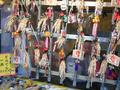 縁起物の市だけに、切り山椒をはじめ、打出の小槌とか南天の箸とか、縁起物系の露店も普通のお祭りよりは多かったように感じます。その中で、飴細工というのを見つけました。ピンポン玉ぐらいの飴が、職人さんの手によって数分で動物や鳥に変わっていきます。おもしろくて、しばらく見とれてました。かなりの人垣ができていました。昔の縁日では、けっこう当たり前にあったようなのですが、私ははじめて見ました。見ている人ばかりで、買ってる人が少ないのは、お店の人にとっては困りものかもしれませんけど(^_^;)