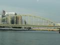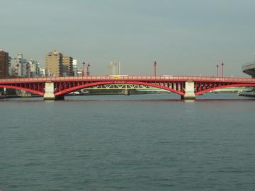 海に近いほうから「勝鬨橋」。昔は大きな船が通るときは橋が上がったそうですが、いまでは固定されています。橋が上がってゲートが開く姿というのも見てみたい気がしますけど。次が「佃大橋」、「中央大橋」、「永代橋」、「隅田川大橋」、「清洲橋」、「新大橋」、「両国橋」、「蔵前橋」、「厩橋」、「駒形橋」、そして終点「吾妻橋」に到着。3本先の橋が見えるくらいみんな接近してるんですけどね。興味のない人には、つまんない話だろうなぁ(^_^;)