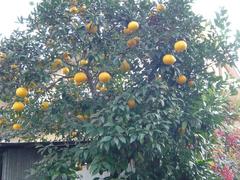 途切れたところに、実をつけた木があるのもいいですねぇ。誰も収穫しないのでしょうか、たわわに実っています。いままで、こんなところに、こんな大きな実をつけている木があることに気づきませんでした。柚子でしょうかね?