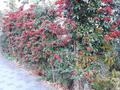 濃いピンクの花をつけた椿は、周りがくすんだ色ばかりなので目立ちます。塀に貼りついているように見える生垣も気に入りました(笑) まぶしいくらい真っ赤な南天の生垣も見つけました。和風でも、洋風でも、植物の垣根はいいですね。ブロック塀は寂し過ぎます。