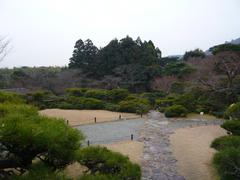 庭園は高低があり、いろいろな表情を見せていて、見事なものです。足元の踏み石に気をとられ、下を向いていた顔を上げると、そこに絶景が広がっていたり、植え込みを曲がるとまた違った風景に出会えたり。来てよかった〜、ほんとに。入園料にはお茶席券がついてくるので、庭園を廻った後に緋毛氈のお茶席で一服のお茶をいただきました。春には花の、秋には紅葉の絶景が見られるようですが、冬枯れの庭と山々を眺めながらの一服も捨てたものではありません。