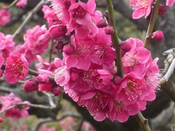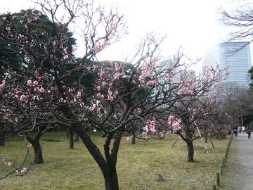 水上バスは、小さな水門(築地川水門)を通って、浜離宮の船着場へ到着します。梅林は船着場のすぐそばから始まって、かなり広範囲に広がっています。まだ、つぼみの木も多いですが、まもなく見ごろを迎えようかというところ。7・2分咲きくらいでしょうかねぇ。奥のほうには見事に満開となっている梅もありました。