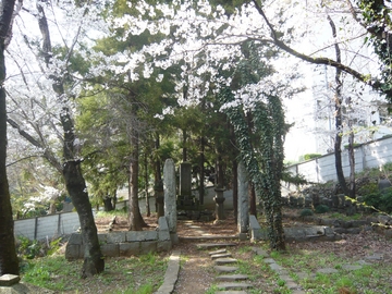本堂の右手には三重塔、左手には五重塔が立ち、この五重塔のところからゆるやかな坂をのぼったさらに左奥に大井夫人の墓所があります。墓所の周りにはひっそりと桜の花が咲いているという風情ですが、この桜、幹には蔦がぎっしりと絡みついていて、息ができるのかしら? という感じ。