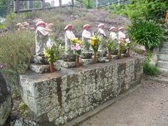 甲斐霊場81番の伝嗣院は小高い丘の上にあり、甲府盆地が一望できます。山門から入る参道は階段になっているので、クルマは裏から失礼しました。本来であれば、山門をくぐってたくさんの石仏群に迎えられてお参りするところですが、本堂が先で山門があと。ゆっくり降りていくと、どこまでも石仏群が続いているのに驚かされました。