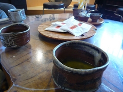 工房にはギャラリーと津軽茶道美術館が併設されていて、理桂作品の大きなツボや古伊万里などの素晴らしい作品も展示されています。そして、サロンでは作品の茶碗で一服のお茶をご馳走になりました。うーん、やっぱりお茶もおいしくなっていたように感じます。貧乏を質に入れて、カップを一つ、ついに買ってきてしまいました〜(^_^;)