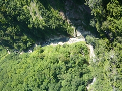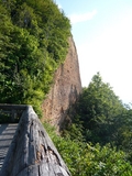 谷底から橋までの高さは122メートルで日本一だとか。橋の真ん中の歩道にプレートが埋め込まれています。橋桁から谷を覗くと、そこに柵があるのは間違いないのに、ぞわっとしたものが這い上がってきます。高い! そして、怖い! 谷底にかかっている橋が、おもちゃの梯子のように見えます。