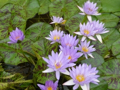 いま、温室から外の池に連れ出されているのは、「熱帯スイレン」だそうです。真夏だけは外でも生きていけるのでしょうが、今日は涼しいを通り越して上着が必要なくらいだったので、本来は熱帯で生きる睡蓮は震え上がっていたかもしれません。