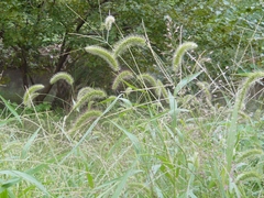 そうやって見てみると、茎を引っ張って、どっちが強いか遊んだ草もあります。これも名前は知らないのだけれど、かっこうの道草材料だったような。そして、猫じゃらし。「エノコログサ(狗尾草)」というそうですね。本名は犬の視点、俗名は猫の視点。まあ、犬のしっぽにも見えますが、猫じゃらしのほうが感じが出ているような気もします。