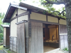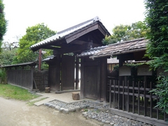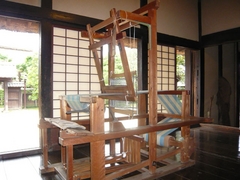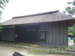 この民家園は、1988(昭和63)年11月に開園。名主だった安藤家のお屋敷には主屋1棟、庭には土蔵があり、ちゃんと門もついています。中に入ると機織機や内倉に収められた櫃などを見ることができます。名主の家らしく式台もついていて、入口の感じは小さいながら本陣の様子にちょっと似ていました。土間も広く、農業用具がたくさんありました。