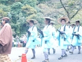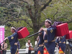 続いて、露払いを先頭に、六尺、挟み箱、毛槍を持った奴さんの登場。歩き方が独特でおもしろいですね。挟み箱と毛槍を空中に投げて相手が受け取るのはすべてのタイミングが合っていて、見ごたえがあります。拍手がわきました。そして弓隊、鉄砲隊、徒士隊と続き、お小姓と大名の駕籠とそれを守る家老たち、奥女中、長持などがやってきます。正直にいうともっと会津祭りのような長い行列を予想していたので、ちょっとあっけなかったですが。