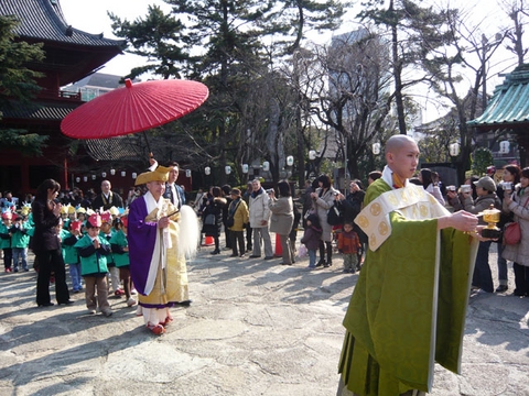三門に着くとあれ? いま始まった? こちらも遅れたのでしょうか、お練の行列が動き始めたばかりです。僧侶を先頭にいかめしく裃をつけた年男年女の方々、おそろいのかわいい裃もどき(笑)をつけた増上寺明徳幼稚園の園児たちがゆったりあるいています。それではとばかり、行列の先頭まで走った、走った! そして息を切らしながら写真を撮ったのでありました。