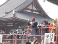 豆まきをするのは年男・年女ということになっています。俳優の中村玉緒さん、60歳ですかね。野球の田口壮選手、36歳かしら? そのほか、お相撲の何とか親方、落語家の方々、プロレスの方々? たくさんの芸能人や有名人の方々が豆まき役です。まかれるのも豆ばかりではなくタオルやお菓子や、ひざ掛けのようなものも舞っています。私は後ろのほうで写真を撮っていたので、何一つゲットできず(-_-;) しかたないですね、なかなか二兎は追えません。