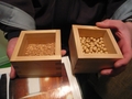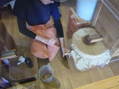 次の工程は、樽の中で十分発酵してどろどろになった大豆と小麦を搾るところ。特殊な布に樽から汲み上げた醤油のモトを広げ、何層にも重ねてプレスして醤油を搾り出します。外に「搾りカス」もありました。ちょっとちぎって食べさせてもらいましたが、ただしょっぱいだけ(笑) これは牛の飼料になるそうです。「牛が塩分を摂り過ぎになりませんか」なんてバカな質問をしたのですが、牛は塩をなめさせて育てるというくらいで、ものすごく塩分が必要な動物なので、ちょうどいい飼料になるのだそうです。なるほど。