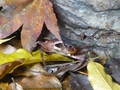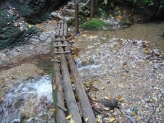 すぐに「天狗滝」へ到着しました。落差20メートルだそうです。雨上がりで足元がかなり危なかったのですが、せっかくだからと近くまで行ってみました。木の渡しは細くて滑って、ちょっと怖い感じですが、慎重に、慎重に。ゆっくり足元を見ながら歩いていたら、沢蟹にも遭遇しました。