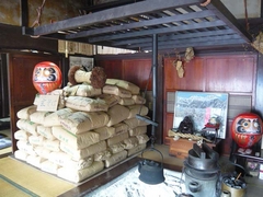 入口を入ってすぐの部屋に、今年の蕎麦粉の袋が山積みになっていました。このお蕎麦屋さんは自分のところで蕎麦畑をもっているということですが、それだけでは足りないので他からも仕入れているとのこと。片目だけ墨の入っただるまさんと一緒に積んである蕎麦粉の袋はほとんどは大町から来たもの、少しだけ群馬県産の袋が混じっていました。いずれにしても「国産だよ〜!」というアピールなのでしょうか(^_^;)