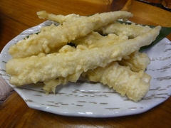 ここでは限定で十割蕎麦も扱っています。まだ一人前ぐらいはできるというので、一つだけ頼んでみました。二八よりは、ちょっとコシが強い感じでしょうか。私は、十割にはちょっとぽそっとした感じを受けるので、二八のほうが好きです。今年はひめたけのこの天ぷらも頼んでみました。これはさくっとしていて柔らかく、おいしいたけのこでした。なぜかお蕎麦に天ぷらって合いますね。