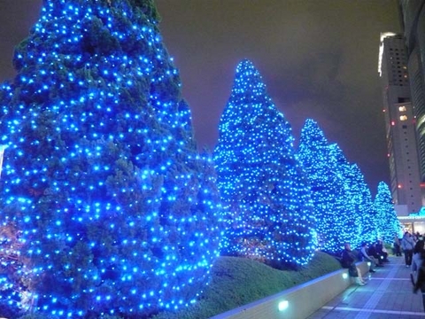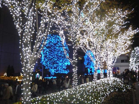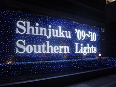 今年もサザンテラスのイルミネーションが始まりました。といっても、始まったことをまったく知らずに夕暮れの新宿を徘徊。サザンテラスに行ってみると、あれ、イルミネーションがないじゃない? 「今年はやらないのかなぁ?」「不況だしねぇ」などと連れと話しながら、広い横断歩道を渡って、帰りかけました。「さよなら」と別れる前に、ちょっと後を振り返った連れが、「わっ、灯った!」