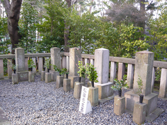 社殿の左奥には吉田松陰ならびに長州藩の志士たちのお墓所があります。神社にお墓……、あるんですね。蛤御門の変で幕府が松陰先生のお墓を壊しちゃったお詫びに送った石燈籠などもありました。明治になっちゃったからには、お詫びをしておかないとねぇ(笑) 境内には立派な石燈籠がずらっと並んでいます。32基もあるそうな。これらは伊藤博文や山県有朋などから1908(明治41)年に奉納されたものだそうです。明治政府のお歴々が深く頭を垂れた場所なのでしょう。いまも平日の中途半端な時間であるにもかかわらず、ポツリポツリと参拝の方々の姿がありました。