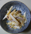 穂高のわさびは、買ってきてすぐ食べると鼻にきます(笑) 作った日から2、3日置いて、それからおもむろに食べ始めるのがいいようです。わさび漬のままでもいただきますが、イカのきれっぱしを買ってきて「わさびイカ」を作ってみました。好みで醤油をほんの少し加えるのもおいしいです。