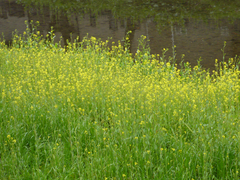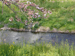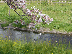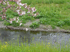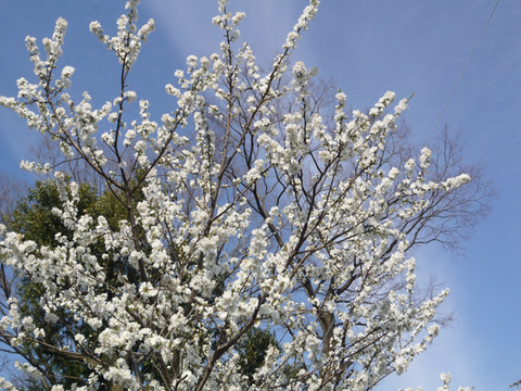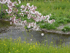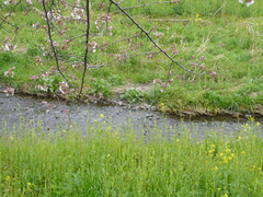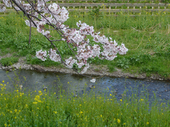 この真っ白い花はなんでしょう? 白い桜ってあるのでしょうか? ソメイヨシノよりはかなり早く、大寒桜よりは遅れて、満開になっていました。河原からはいい匂いが漂ってきます。菜の花もそろそろ満開になりそう。この川では桜と菜の花が同時に開花し、緑の中にピンクと黄色の美しいコントラストを見せています。