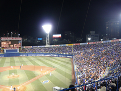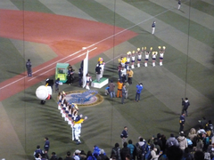 手袋をしていたので、手に汗は握りませんでしたが、今日はいい試合を見せてもらいました。後半は、ずっと緊張させられる展開だったので、最終回、スレッジ選手のさよならホームランが夜空に吸い込まれていったとき、思わず涙が……(^_^;) 私だけではなく、近くにいた、もう若いとはいえないおにいさんも「涙が出てきちゃったよ〜」といって目をこすっていたのでした。こういうのを「感動したーっ!」って、いうのかしらね(笑)