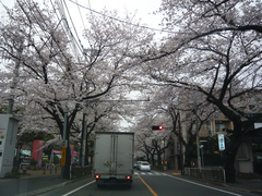 走り出して気づいたのですが、街路樹にもけっこう桜並木が多いのですね。幾度の桜のトンネルを抜けた感じです。東八道路の宇宙航空技術研究所でしたか、ちょっと前までは航空技研といっていた建物のあたりから、三鷹通りを大成高校のあたりまで、かなり長い桜並木が続いていました。今日は天気があまりよくなくて、しかも夕方近かったのでいまひとつの感じですが、青空が背景にあればきっともっと美しいのではないかと思います。