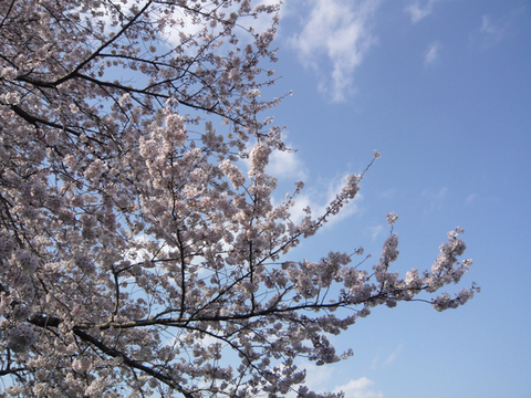 お天気になって、気温も上がって、1週間にわたって観察してきた野川の桜もほぼ満開になりました。ときおり飛ばされそうになるくらいの強風が吹いていて、風の音が怖いぐらいです。風邪に押されてふらついたりして。けれども、まだ若い桜の花びらはしっかりしていて、風に散ることはありません。青空に伸び上がり、風に揺れている姿もきれいですね。