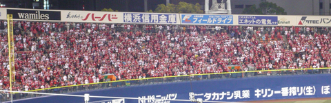 広島方面から、遊びがてらこちらにいらしている人も多いのかもしれませんね。ライトスタンドは真っ赤。レフトスタンドは、青とホームなので白も。合わせればフランス国旗みたいなものですが、きっちりと棲み分けしています(笑) カープの応援は、いつも元気でいいなぁ〜なんて言っているうちに、観戦初黒星をいただきました。今日のマエケンは、そう調子がよさそうでもなかったのに……。ヒットは散発で、戦犯も決められない(笑) この勝率のチームで、この時期になって初黒星なんて言っているのは、とどのつまりは、今年は観戦数が少ないということです。