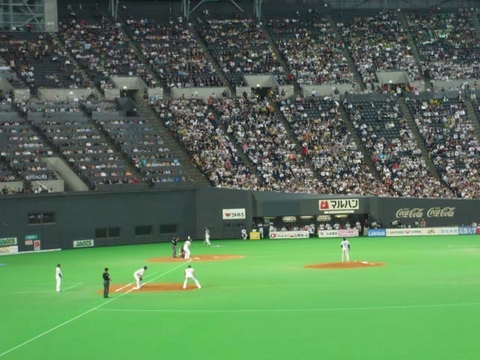 野球はお空の下でやるのが一番! と思うのですが、札幌ドームは天井が高いというだけでなくいろいろな建築上の工夫もあるのかもしれませんが、東京ドームなどと違って閉塞感がありません。人工芝の緑も鮮やかで、明るい感じのするドームです。階段や通路が思いっきり広いからかもしれませんね。ただし、座席に入る通路は狭くて、かなり急。上り下りするのはけっこう疲れます(^_^;;