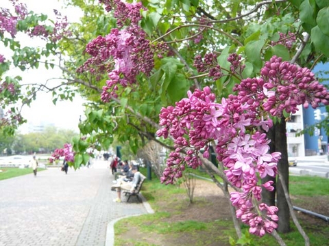 大通り公園では、ちょうどライラック祭が始まっていました。でも、今年はやはり花が遅いのでしょうか。白い花はかなり開いていますが、ピンクや紫は一分、二分、日当たりのよさそうな枝だけが花をつけている程度です。来週くらいが見ごろかもしれません。