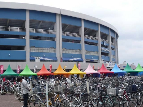 交流戦だからというわけではないのでしょう。いつもかわいらしいテントの屋台が建ち並んでいます。千葉の味や世界のおいしいものやらを商う店がたくさんあり、野球に興味のない人でもそれなりに楽しめそう。テーブルを囲んで賑やかに食事をしている家族連れなどは、ひょっとしたらスタジアムに入らずにお帰りになるのかも(^_^;)