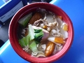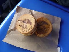 交流戦限定という「房総チャンコ」という食べ物を売っていたので、買ってみました。昼間の試合だというのになんだかだんだん寒くなっていく日で、暖かそうなスープに誘惑されたのでありました。さっぱりしていそうに見えたのですが、あんがいボリュームがありました。プラス、「マークン焼き」というマリーンズのマスコットの似顔絵入りのドラ焼き。焼きたて熱々です。