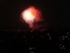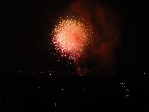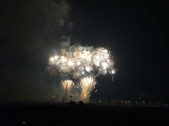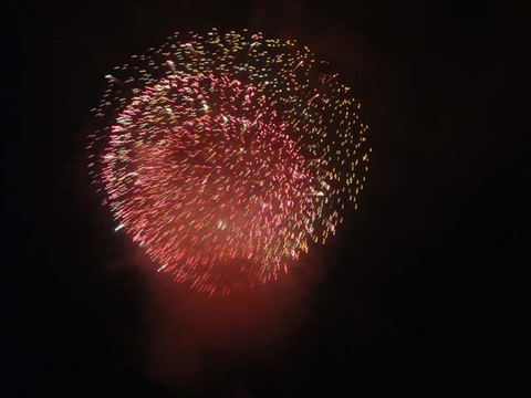 大輪の花が咲く大玉も美しいけれど、小さな花がいっぱい咲いているのもきれいでした。フラッシュのようなもの、ニコマークみたいなもの、ガーベラの花が咲いているような花火もありました。花火を見るのは久しぶりのような気がしますが、毎年、新しい種類が増えるようです。きれい、きれい! ポンポンポンと炸裂して、戦争?というようなものもありました(^_^;)