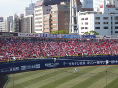 レフトスタンドは、真っ赤なお花畑。カープも、まあ、残念な成績ではありますが、それでもスタンドはぎっしりで、みんな楽しそうに応援していました。ライトの青い人のほうが数は少ない……。それも無理もないかもというくらい、本日の試合はひどかったなぁ。負けてもいいけど負けっぷりが……、ひどすぎる! 「やる気、あるのか〜!」と思わず叫んでしまいそうな内容ですねぇ。さすがに温厚な?私たちも憮然でありました(^_^;)