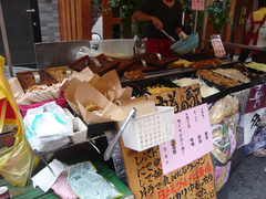 地下鉄「小伝馬町」の駅を降りると、裏手にべったら漬けの露店をはじめ、たくさんの店が出ていて、活気のある縁日になっています。焼き蕎麦、お好み焼き、たこ焼き、焼き鳥、おでんなどの縁日の定番のほか、いま話題のラーメンバーガーやシャオビン、タイラーメンなど世界中から露店がやってきた!というくらいさまざまな食べ物を売る店が建ち並んでいます。