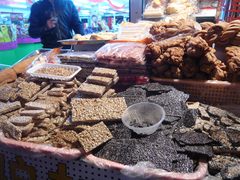 王府井は、小さなお店や屋台が並んでいる狭い路地の連なりですが、ちょっと広くなっているところでは、イートインというのかな、フードコートというのかな、お店の前に椅子やテーブルが出されていて、いくつかの店で好きなものを買って、その場で食べられるように設えられている場所もあります。京劇みたいな衣装を着た歌手の歌のサービスもあったりして。結局、目的だった万里の長城をのぞけば、北京でいちばん楽しかったのはここかも。