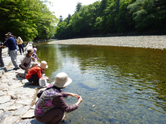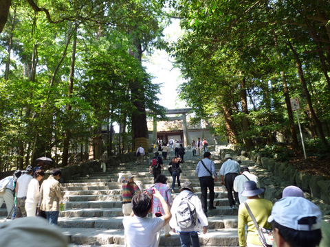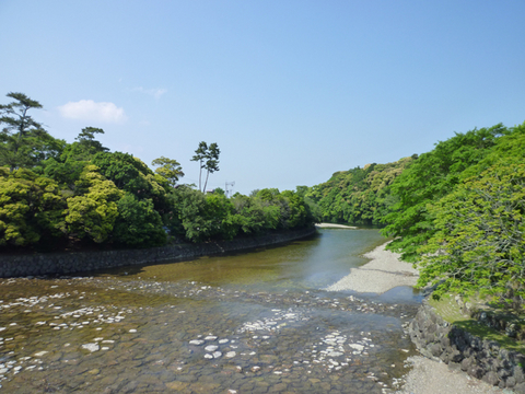 参道は新緑の季節を迎えて、確かに緑が深く、静かだったらそぞろ歩きにいいでしょうね。しかしながら、かなり賑やか。途中で具合が悪くなって倒れた人にも遭遇しちゃいました。大丈夫だったでしょうか? 有名な五十鈴川でもお清めをしている人もいましたが、いま水質が悪いので口をすすぐのは禁止のようです。手前に手水場があり、こちらでどうぞという具合になっていました。