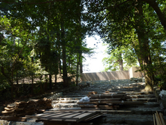 伊勢神宮は原則として20年ごとに、内外両宮の正宮の正殿を始めとしてさまざまな社殿計65棟のすべてを造り替かえる「式年遷宮」というのが行われます。記録によれば第1回は690年に行われたとか。その後、中断や幾度かの延期もあったものの、1993(平成5)の第61回式年遷宮まで続いているそうです。2005年から第62回が進行中。2013年には内宮が予定されているということで、次に遷宮される場所というのがすでに確保されていました。大勢の作業員の方がヘルメット姿でお仕事中。ここの立ち入り禁止はしかたがないですね、危ないもん(笑)