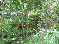 公園の端のほうには、いまも「玉川上水」が流れています。細いせせらぎですけど、江戸時代の人々はこの水を飲んでいたのでしょう。ここで自殺しようした人もおりましたが、いまの流れでは死ぬに死ねない心細さです。うっそうと繁った木々や下草は、往時の面影を残しているのかもしれません。江戸時代にこの辺を歩いたことはなかったので、さすがに比べることはできませんが(^_^;) 枝のすきまから、ほんの少しだけ流れを見ることができます。