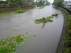 氾濫ラインまであと数メートルというところですが、これ以上水位が上がることはまずありません。多摩川へ放流する水路の位置がきっとこのラインに設定されているのでしょう。普段はテニスコート8面プラス野球場2つぐらいの調整池も設けられているようなので、氾濫の心配はしていませんでしたが、台風のピーク時には舞い上がる雨と川に叩きつけられる雨のスペクタクルが、映画顔負けというくらい迫力がありました。