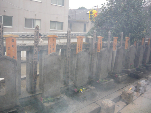 お墓が並んでいて、みんなグルグルと順番に線香を手向けているようです。ここに47基あるのでしょうかね? 墓所内は線香の煙でちょっとした煙幕がはられているよう。視界が霞んでいます。写真もピントの問題ではなく、ぼんやりと写るくらいです。熱心な方は、1基に1本ずつの線香を手向け、手を合わせておいででしたが、たいがいの人は観光客で(笑) 私もしかり。ひとつひとつに手を合わせることもなく、100円のお線香さえ買わず……すみません(^_^;) 実は忠臣蔵の芝居を見たこともなく。